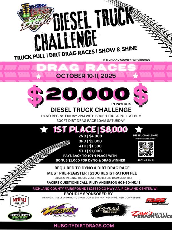 Start your engines and mark your calendars for the HUB CITY Diesel Truck Challenge —the Midwest’s most exciting season kick-off event at the Richland County Fairgrounds! Join us as we bring the heat with two adrenaline-filled days of racing, pulling, and nonstop action.