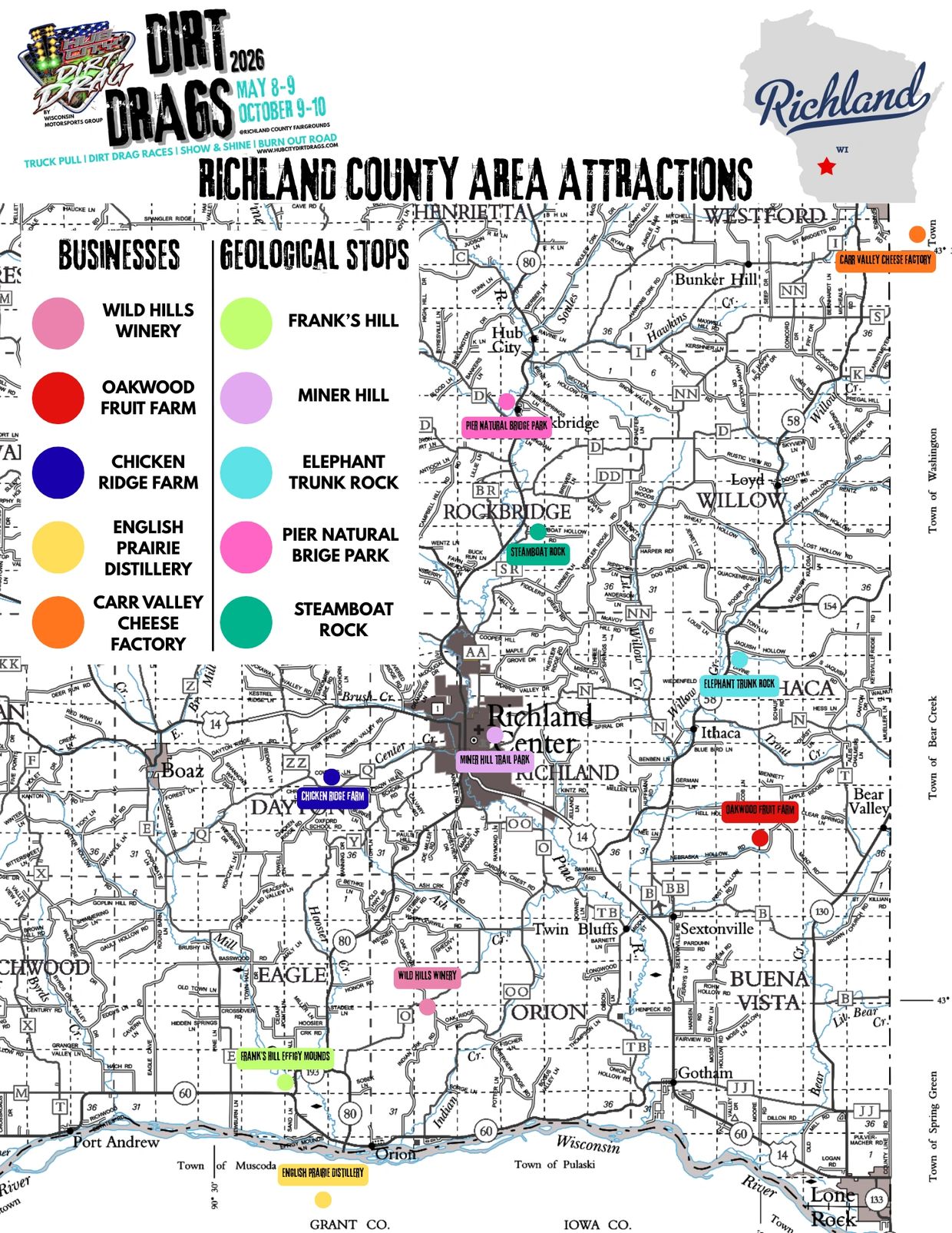 When you come to Richland Center for the Hub City Dirt Drags, don’t miss the chance to experience all that Richland County has to offer. Nestled in the heart of Wisconsin’s Driftless Region, the area is full of rolling hills, scenic drives, and small-town charm. From outdoor adventure to unique shopping and dining, Richland County is the perfect place to make a full weekend out of your trip.